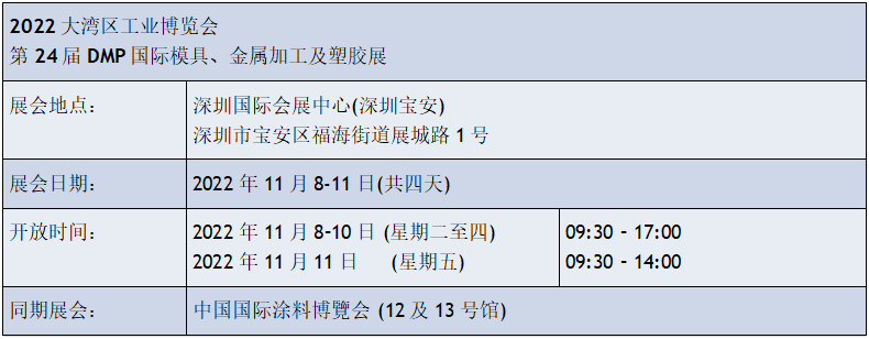 由讯通展览公司举办之2022DMP大湾区工业博览会(以下简称DMP工博会),将于2022年11月8-11日在深圳国际会展中心(深圳宝安)举行!此大型工业界盛事汇聚世界各地知名机械制造商,绝对不容错过!