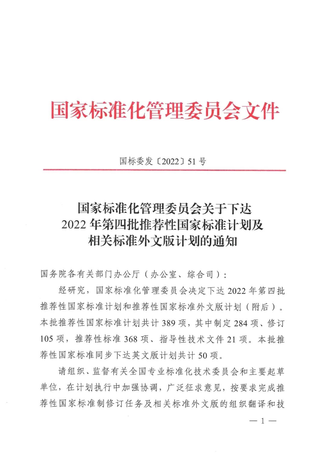 此批推荐性国家标准计划共计389项,其中制定284项、修订105项,推荐性标准368项、指导性技术文件21项;推荐性国家标准同步下达英文版计划共计50项。
