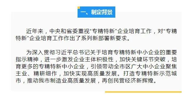 第一部分,总体要求。明确了指导思想和主要目标。为进一步明确方向、统一思想,着重对“专精特新”的定义和内涵进行了深入阐释,提出到2025年全市“专精特新”中小企业的培育目标。