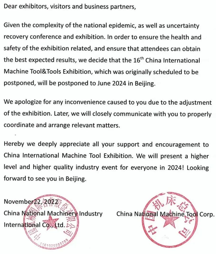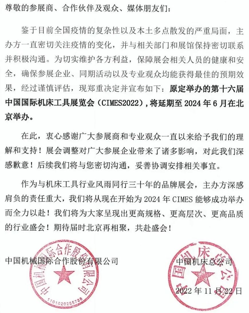鉴于目前全国疫情的复杂性以及本土多点散发的严重局面,主办方一直密切关注疫情的变化,并与相关部门和展馆保持密切联系并积极沟通。为切实维护各方利益,保障展会相关人员的健康和安全,确保参展企业、同期活动以及专业观众均能获得最佳的预期效果,经过谨慎评估,现郑重决定并宣布如下:原定举办的第十六届中国国际机床工具展览会(CIMES2022),将延期至2024年6月在北京举办。