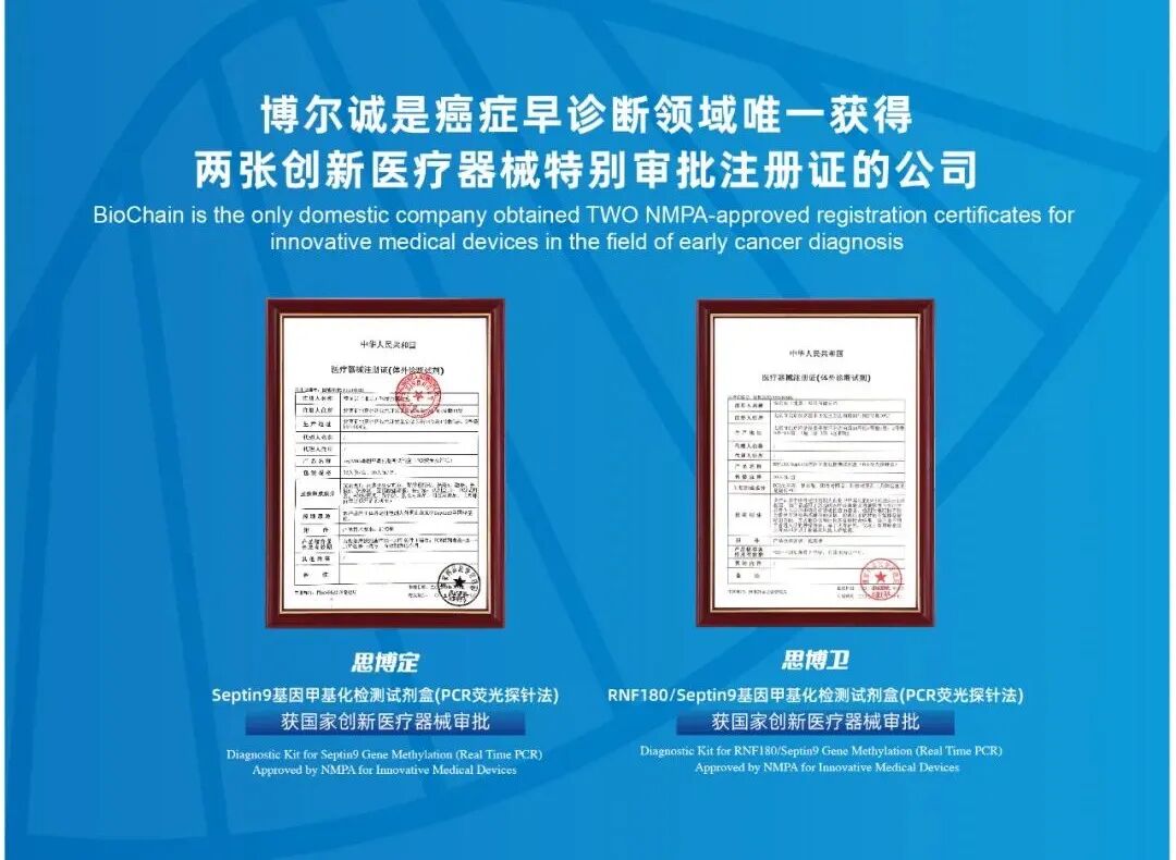 十多年来,博尔诚致力于重大疾病的早发现、早诊断和早干预,深耕甲基化检测在发现早期癌症中的应用,在科研、人才、成果转化等方面得到北京市政府的大力支持,旗下肠癌、胃癌早筛早检产品均为创新医疗器械,填补了国际和国内空白。在“健康中国”国家战略下,博尔诚一直致力于探索和实践癌症等重大疾病早筛早诊的中国方案。自2006年成立以来,博尔诚深耕重疾早筛早诊,奠定了扎实的、系统化的技术优势和平台优势,逐步建立起以甲基化平台、免疫平台、基因检测平台、医疗设备为核心的四大产业化平台,持续为大众提供涵盖癌症、心脑血管病、呼吸道传染病等重大疾病领域早期、精准、安全的产品和服务。肠癌早检产品(思博定®—Septin9基因甲基化检测试剂盒)思博定®是中国第一款获得国家药监局(以下简称“NMPA”)批准、也是最早进入医保(福建省、北京市、上海市)的肠癌基因甲基化检测产品,得到NMPA“国内首创、具有显著临床应用价值”高度评价。胃癌早检产品(思博卫®—RNF180/Septin9基因甲基化检测试剂盒)思博卫®是全国独家获批且纳入医保(北京市)的胃癌基因甲基化检测产品,填补国际空白,弥补了传统检测技术用于胃癌早期检测的不足。截至目前,博尔诚旗下已有多款产品通过欧盟CE认证,产品管线涵盖癌症早筛早检系列、POCM(Point of Care Management)系列产品、新冠抗原检测系列产品等,上述系列产品在技术、质量、安全方面已与国际接轨,可在欧盟27个成员国及其他认可欧盟CE认证的国家上市销售,是博尔诚拓展国外市场的强有力支撑和保障。