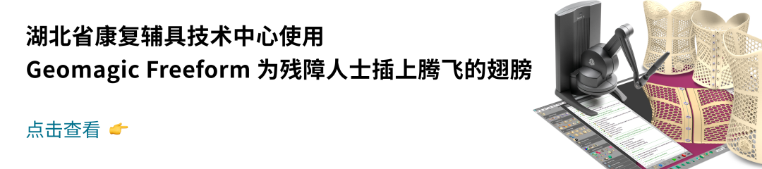 Geomagic Freeform 是一款基于触摸的触觉设备相结合的 3D 设计软件,它将传统的手工艺转化为有机的、数字化的定制设计。有助于实现 3D 扫描处理、客制化设计以及增材制造生产全链路。满足了对假肢的功能性、舒适性以及美观性的高标准需求,提供了数字化设计的解决方案。