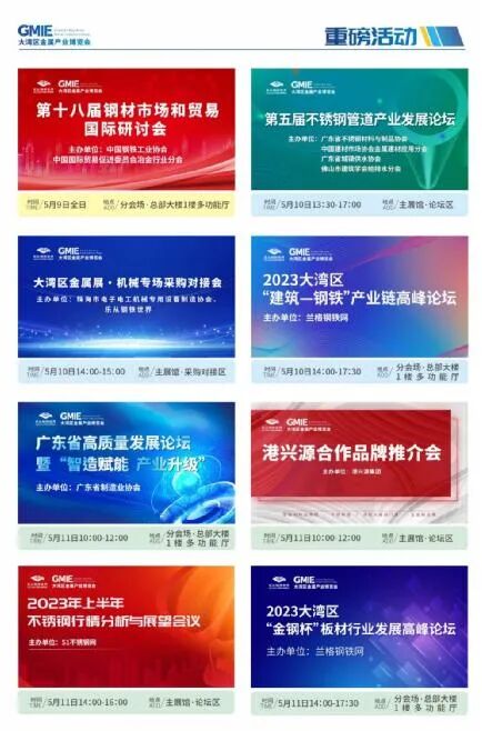 大湾区金属产业博览会携手中国钢铁工业协会、广东省不锈钢材料与制品协会、广东省制造业协会、51不锈钢网、兰格钢铁网等国内商协会、行业平台,展会期间举办多场重磅论坛、行业活动、供需采购对接会等,覆盖钢材、机械、建筑、制造业等领域,特邀行业顶流大咖,聚焦行业前沿趋势,共商市场全新机遇。