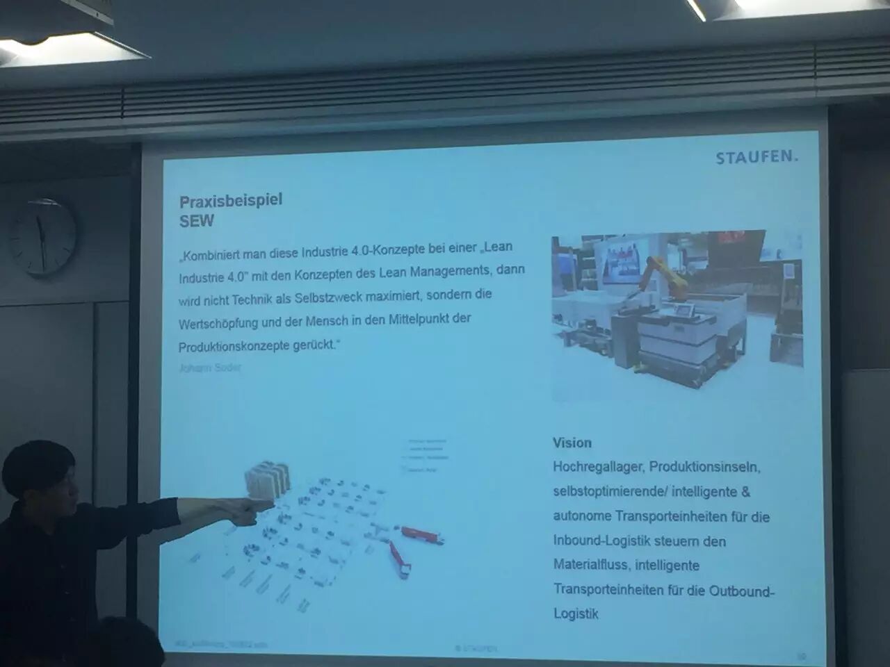 其特点是要求员工有精益管理的执照,首先会对每个员工进行培训,费用是每人15000欧元,人员编织变得顺利后,再过度到工业4.0,着重质量提高和降低成本。德国的人工成本大约为中国的5倍,所以,工厂的目标是当天收到订单,当天完成并提供给顾客。