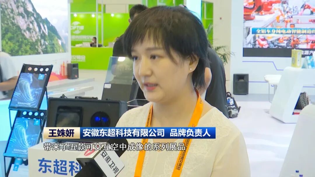 这里是2022中国国际服务贸易交易会的安徽展区,我身旁就是东超科技今年带来的最新款空中成像交互展示机,它集合了医疗、订餐、教学等多个系统,像我这样在空中点击医疗系统,无需接触就可以完成医院挂号、取号等一系列操作,避免了接触带来的感染风险。