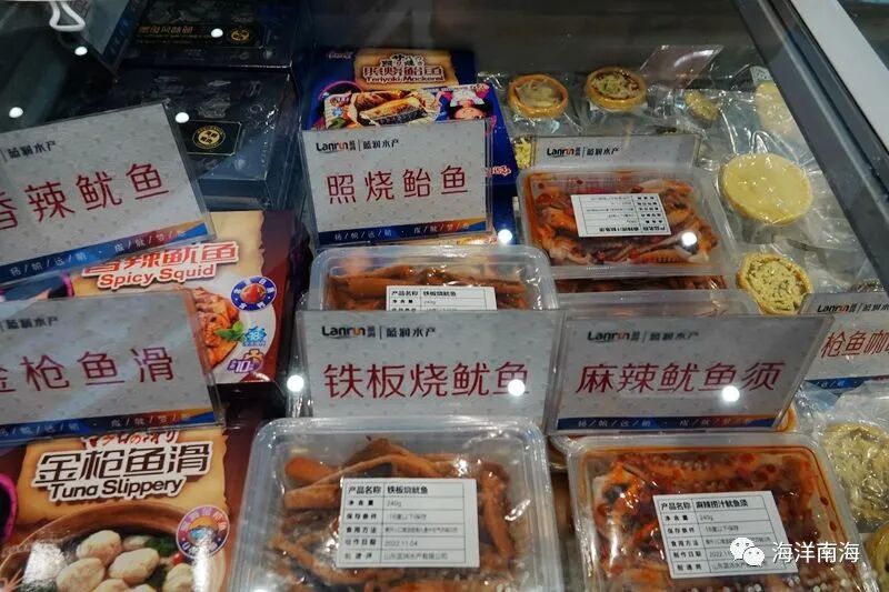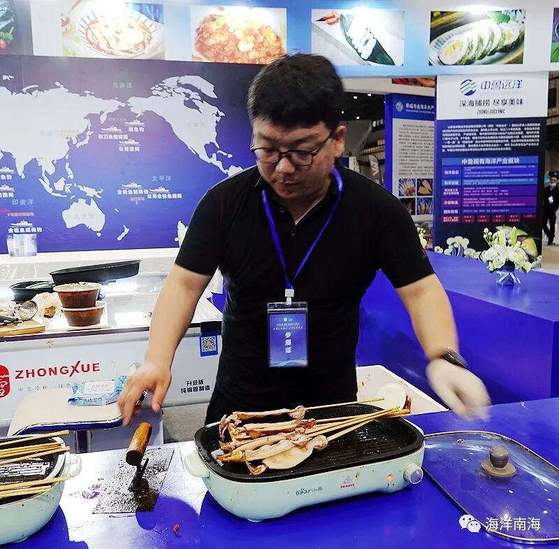 在“海博会”,我们见到了海南翔泰渔业股份有限公司的水产预制菜。该公司近年来跻身预制菜赛道,市场销售额不断增长。“海博会”上,该公司展示了从源头到餐桌全程可追溯的水产预制菜,酸菜鱼、黑虎虾、火爆鱿鱼等预制菜产品现场烹饪、展示,受到参观者的欢迎。