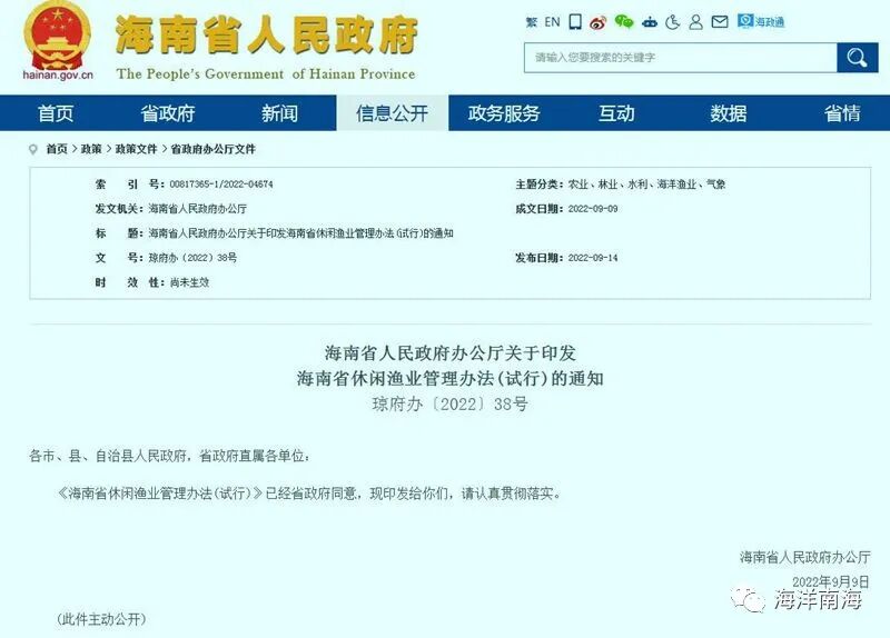 文章称,海南省人民政府办公厅发布的《海南省休闲渔业管理办法(试行)》、《海南省促进休闲渔业高质量发展三年行动方案》,俩文件亮点纷呈,被誉为“开启休闲渔业高质量发展划时代转折点”。俩文件明确指出“鱼鲜美食”“属于休闲渔业业态范畴,要求“开发特色休闲渔业食品、产品”,并将其落实为“海口、三亚、琼海、文昌、万宁、定安、陵水等市县”的责任。