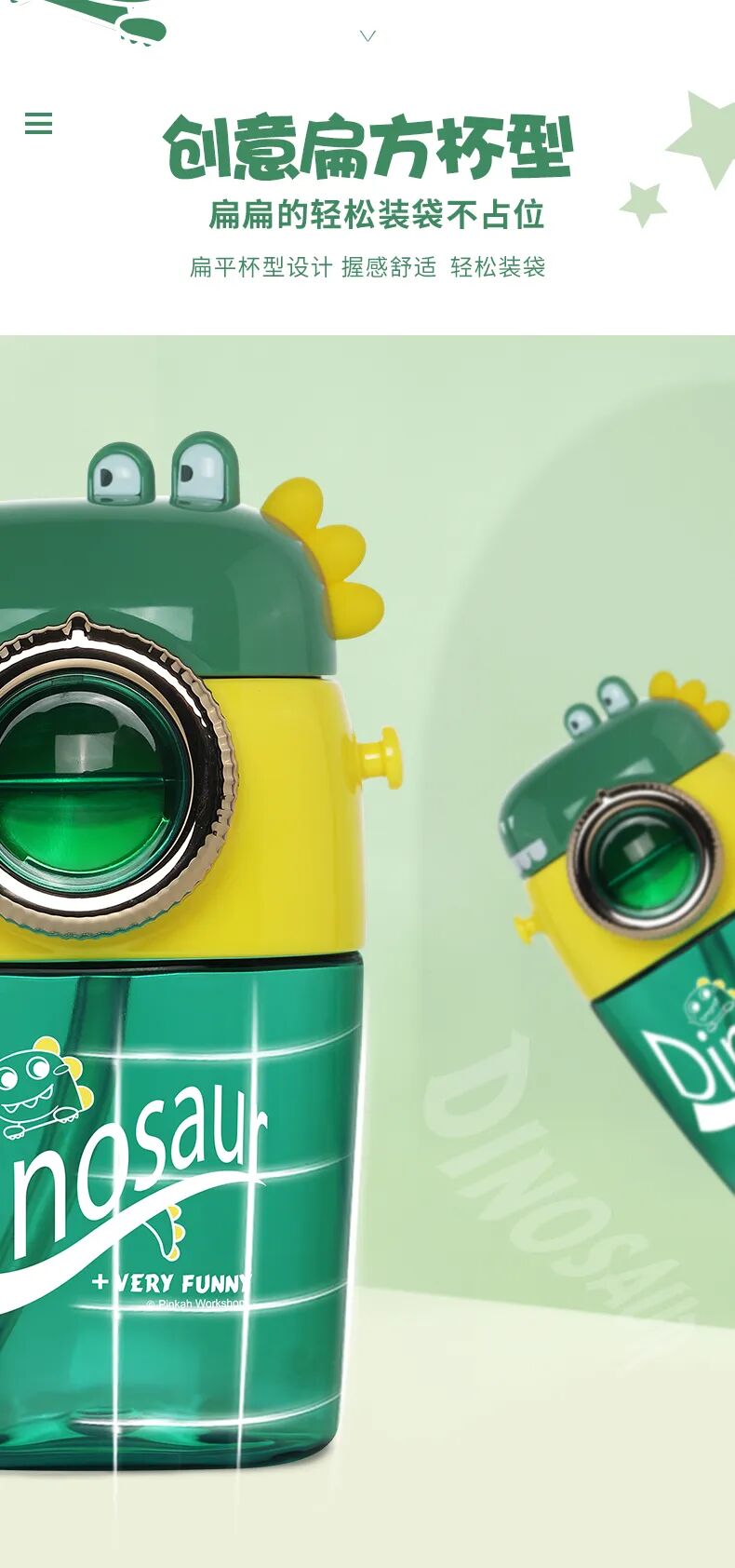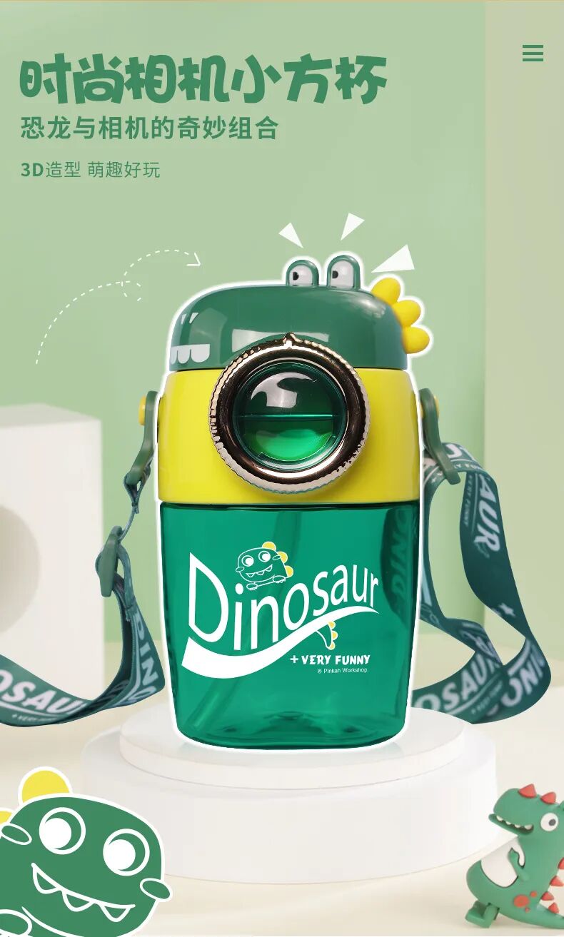 灵感来源复古相机及恐龙形象结合,突破现有不锈钢圆形工艺,杯身扁圆造型设计,背起更贴身,收纳不占位,拿握舒适。瓶身安全无双酚A的Tritan材质,符合环保要求及 FDA,抗摔性高,不易变形,可循环使用。原创设计,外观采用照相机与恐龙造型的创意结合,开盖的方法是调整焦距,新颖独特。