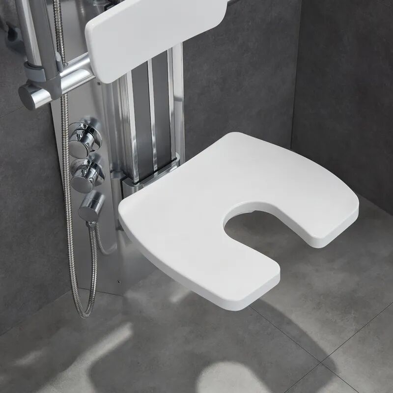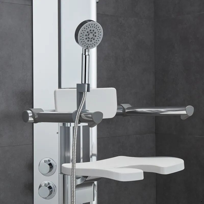 这是一款多功能可调节折叠收纳的老人坐式恒温淋浴设备。由可调节收纳的淋浴凳、淋浴屏恒温龙头、不同方式的顶喷花洒组构而成。淋浴椅的支架是高强度的铝合金材质,座椅面板和靠背则是由高品质的脲醛材质制造而成。背后的淋浴屏面板是优质铝合金面板,整体覆盖了背后所有的水路和接口,让整个浴室看起来更简洁舒适。