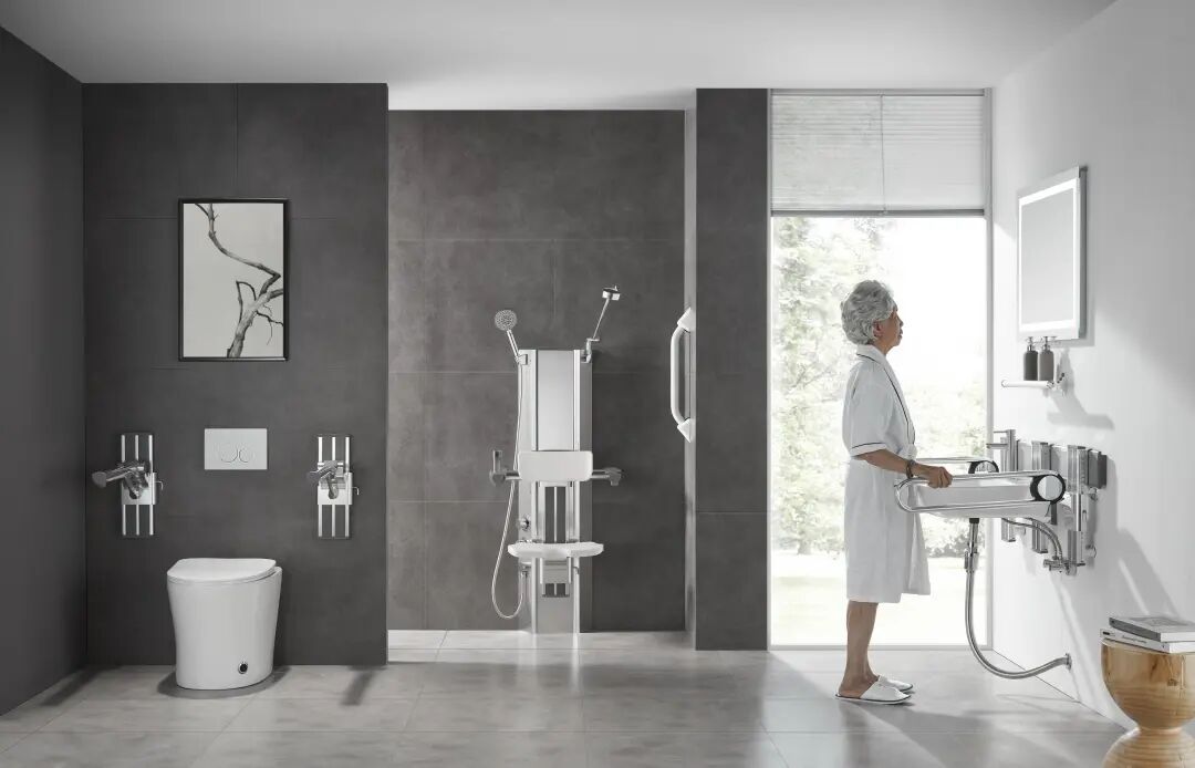 该产品方便将旧浴室改造成老年人使用。淋浴设备接连原有的龙头接口即可,安装简单又美观。坐式浴凳和扶手均可上下调节高度至最舒适的状态,可折叠收纳节省空间。顶洒或伸缩式顶喷出水方式通过浴座旁侧的龙头切换,使用顶洒可解放双手,使用伸缩式顶喷方便全方位洗浴。龙头带恒温,可调温度,可锁定理想温度,防止忽冷忽热。
