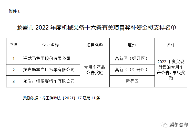 附件:1.龙岩市2022年度机械装备十六条有关项目奖补资金拟支持名单