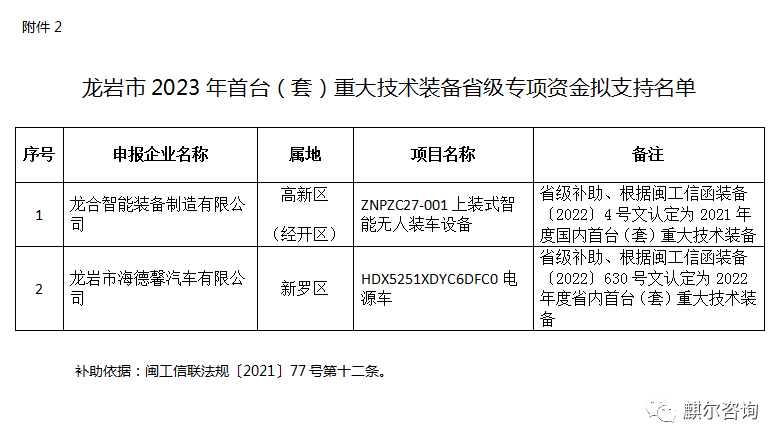 2.龙岩市2023年首台(套)重大技术装备省级专项资金拟支持名单