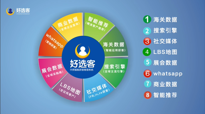 “好选客”隶属于上海驭岳网络科技有限公司旗下品牌,诞生于国家历史文化名城上海宝山区。好选客-外贸智能获客管理系统是一个专注于外贸智能获客领域的企业服务品牌,该品牌下产品功能模块采用大数据、云计算、AI智能等技术,围绕中国80%以上的外贸企业的核心需求进行设计开发,主要帮助外贸企业发现优质采购商、核验身份、监测商机、赋能外贸人员等,提高外贸企业的运营效率和效益。好选客-外贸智能获客系统平台包括搜索引擎、客户画像、贸易数据、社交媒体、地图找客户、全球展会采购商、whatsapp营销、全球商业数据等八大外贸获客渠道,可为外贸企业提供集全球市场分析、精准客户搜索、关键决策人挖掘、深度客户分析、社媒营销、有效邮件营销及专业SCRM客户管理于一体的外贸全流程解决方案。