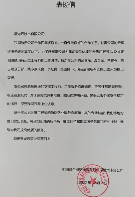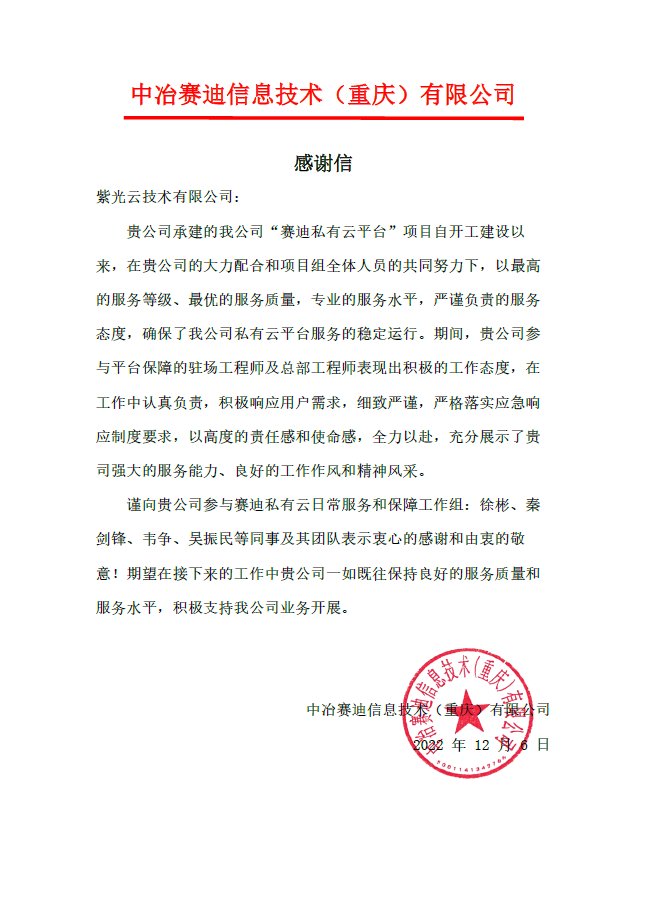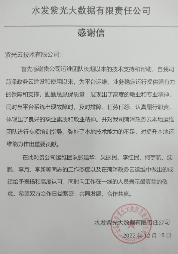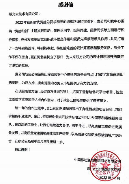 12月,紫光云相继收到来自中冶赛迪信息技术(重庆)有限公司、中国移动通信集团河北有限公司、水发紫光大数据有限责任公司等单位的多封感谢信,对近一年来紫光云项目团队的服务质量和业务能力给予了高度的赞扬和充分的认可。同月,由中国电子学会、信息化和软件服务网主办的“2022中国数字经济城市峰会”在北京举办。紫光云公司数字迁安项目荣获十大数字政府样板工程,滨海城市大脑二期项目荣获十大数字大脑优秀产品,武清数字化疫情防控项目荣获2022数字城市应用示范奖项。