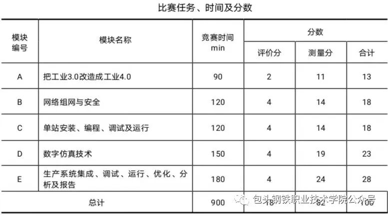 工业4.0项目以团队方式进行,每队两名参赛选手同时开展任务,比赛共分5个任务模块,比赛时间为15小时。