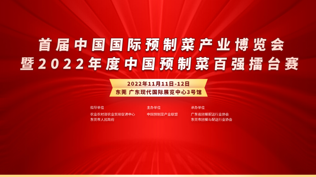 为推动预制菜产业高质量发展,培育发展中国预制菜龙头品牌。首届中国国际预制菜产业博览会暨2022年度中国预制菜百强擂台赛,于2022年11月11日-12日在广东省东莞市厚街镇广东现代国际展览中心举行。