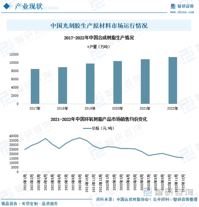 此外,得益于国内合成树脂生产工艺技术水平的提升,及合成树脂产能建设项目的逐步落地,我国合成树脂国产供给能力不断增强的,如南大光电的ArF光刻胶技术研发实现突破且于2021年完成了“ArF光刻胶产品的开发和产业化项目”年产25吨的生产线,国内市场光刻胶用高端合成树脂产品价格呈现下滑态势,如环氧树脂产品价格从2021年初的24968元/吨一路下滑至2022年末的15843元/吨。