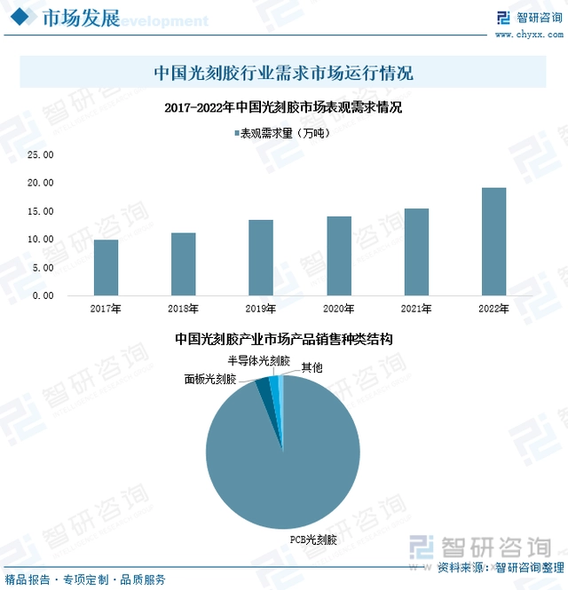 在印刷电路板、显示面板、电子芯片等产品生产中,光刻胶的应用需求市场广泛,随着下游消费电子、航空航天、军工等领域产业不断发展,我国光刻胶需求量不断增长。2022年,我国光刻胶行业下游需求市场表观需求量达19.18万吨,同比增长24.39%,自2017年来的复合增长率达11.66%。值得注意的是,目前,我国光刻胶产业市场主要产品型号种类包括有PCB光刻胶、面板光刻胶、半导体光刻胶等,产业市场消费占比比例分别为94%、3%、2%,行业主要需求市场仍由印制电路板(PCB)产业占据。