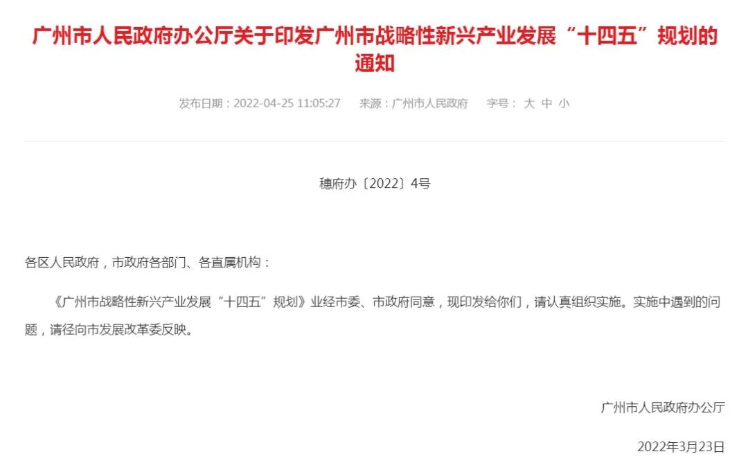 3月23日,广州市人民政府办公厅印发《广州市战略性新兴产业发展“十四五”规划》。