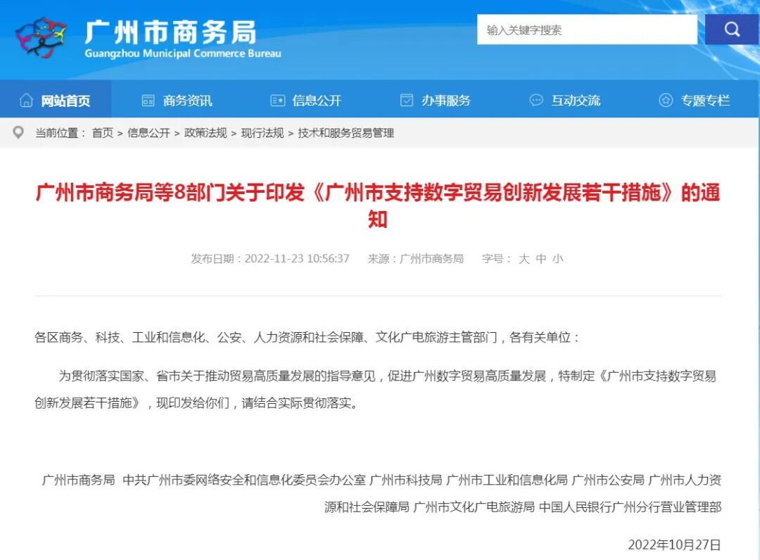 广州市商务局等8部门联合印发《广州市支持数字贸易创新发展若干措施》