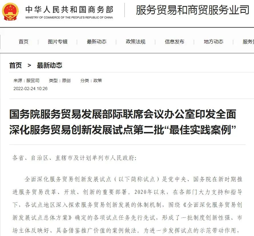2月24日,国务院服务贸易发展部际联席会议办公室发布《全面深化服务贸易创新发展试点第二批“最佳实践案例”的函》,面向全国推出最新17个制度创新性强、市场主体反映好、具备借鉴推广价值的全面深化服务贸易创新发展试点实践案例。