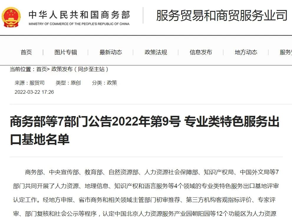 3月22日,商务部会同有关部委公布了新一轮专业类特色服务出口基地名单。
