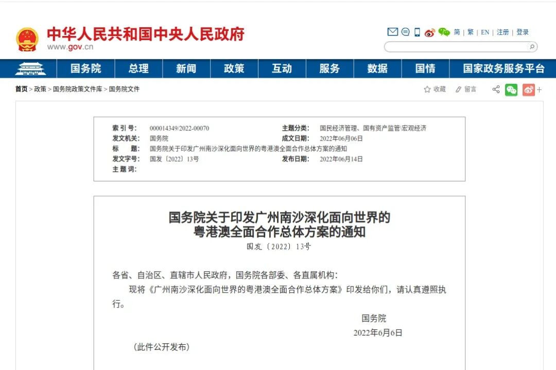 6月14日,国务院正式印发《广州南沙深化面向世界的粤港澳全面合作总体方案》,为加快推动广州南沙深化粤港澳全面合作,打造成为立足湾区、协同港澳、面向世界的重大战略性平台,在粤港澳大湾区建设中更好发挥引领带动作用提供规划保障。