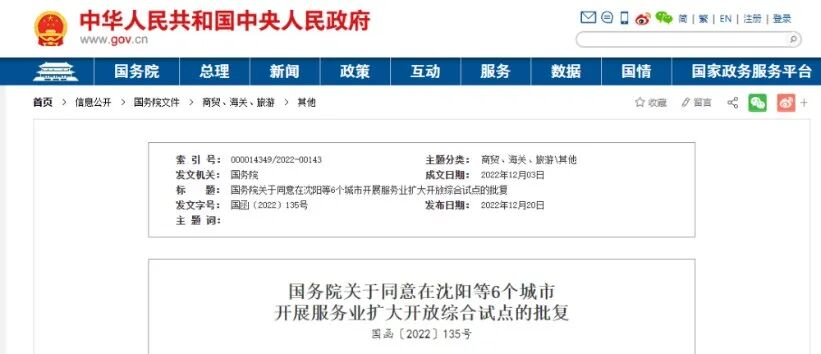 12月20日,中国政府网发布《国务院关于同意在沈阳等6个城市开展服务业扩大开放综合试点的批复》,广州、沈阳、南京、杭州、武汉、成都等六市获批开展服务业扩大开放综合试点。