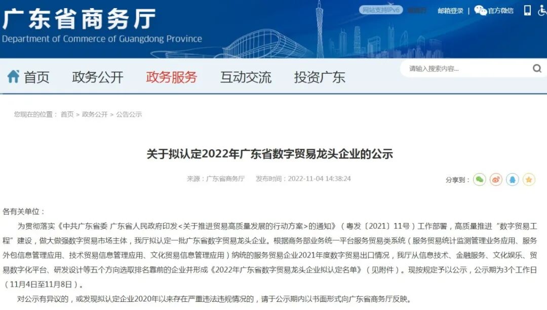 11月4日,广东省商务厅认定2022年广东省数字贸易龙头企业。广州数字贸易代表企业汇丰软件、广电运通(金融服务类),酷狗、三七互娱(文化娱乐类),卓志跨境电商、希音(贸易数字化平台类),本田技研、美的华凌(研发设计类),四三九九、简悦信息(信息技术类)等35家数字贸易企业入选首批数字贸易龙头企业,占全省龙头企业的三分之一以上。