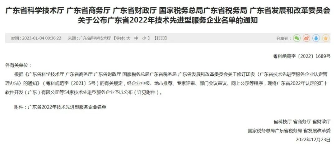 12月23日,广东省科学技术厅、广东省商务厅、广东省财政厅、国家税务总局广东省税务局、广东省发展和改革委员会公布《广东省2022年技术先进型服务企业名单》。汇丰软件、哆啦科技、富卫信息等38家广州市服务贸易企业入选。
