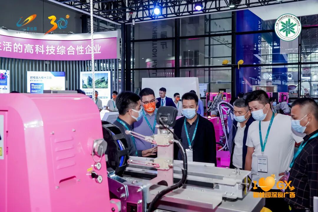 一抹抹靓丽的粉红色,充满“赛博朋克”色彩的展馆,腻子打磨机器人,高效运转的测量机器人,高悬半空的外墙喷涂机器人,碧桂园在现场别具一格的画风,可谓是吸睛力十足!