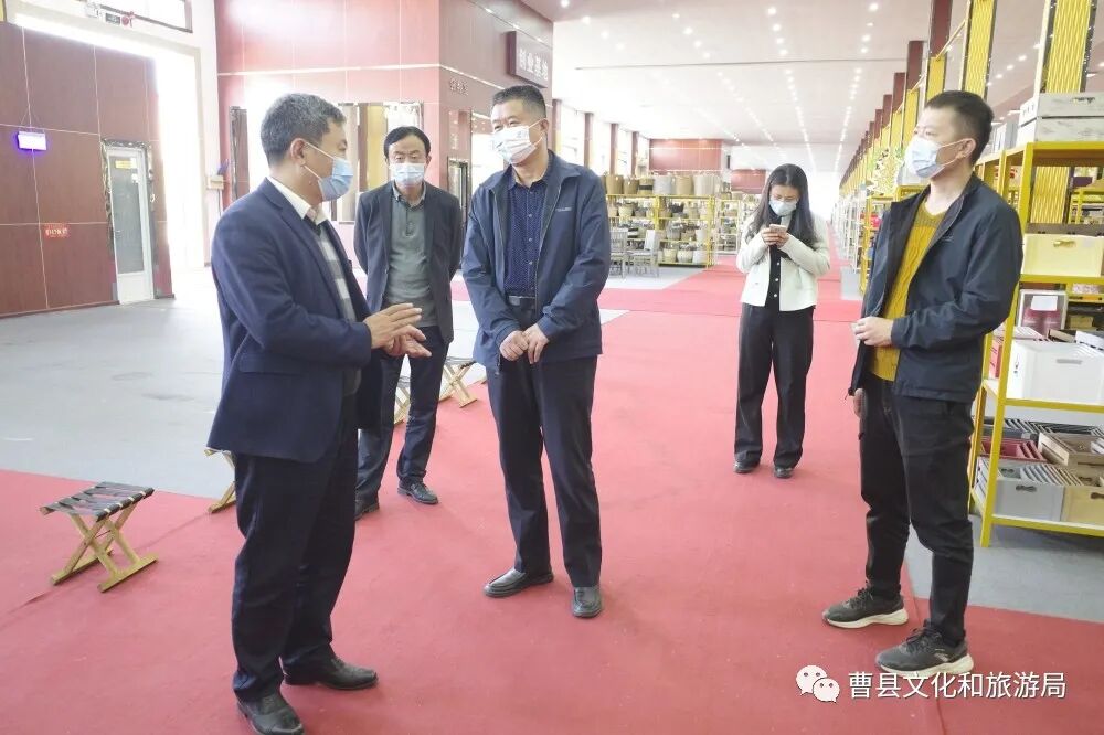 10月10日,菏泽市文化和旅游局党组成员、副局长朱政,菏泽市乡村振兴局黄河滩区脱贫迁建组组长李锋,菏泽市文化和旅游局非遗科科长朱晓雯,非遗科四级主任科员王磊一行到曹县云龙木雕工艺有限公司、曹县辰霏服饰有限公司、雅尚名品家居有限公司调研非遗工坊项目建设和推动落实工作,曹县文化和旅游局党组书记、局长孔繁星,曹县文化和旅游局正科级干部黄贤朋陪同调研。