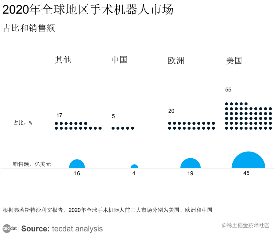 根据弗若斯特沙利文报告,2020年全球手术机器人市场的前三大市场分别为美国、欧洲和中国,占据了市场份额的55.1%、21.4%和5.1%。