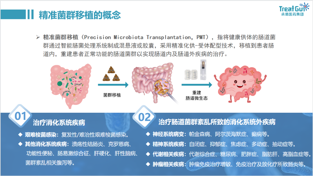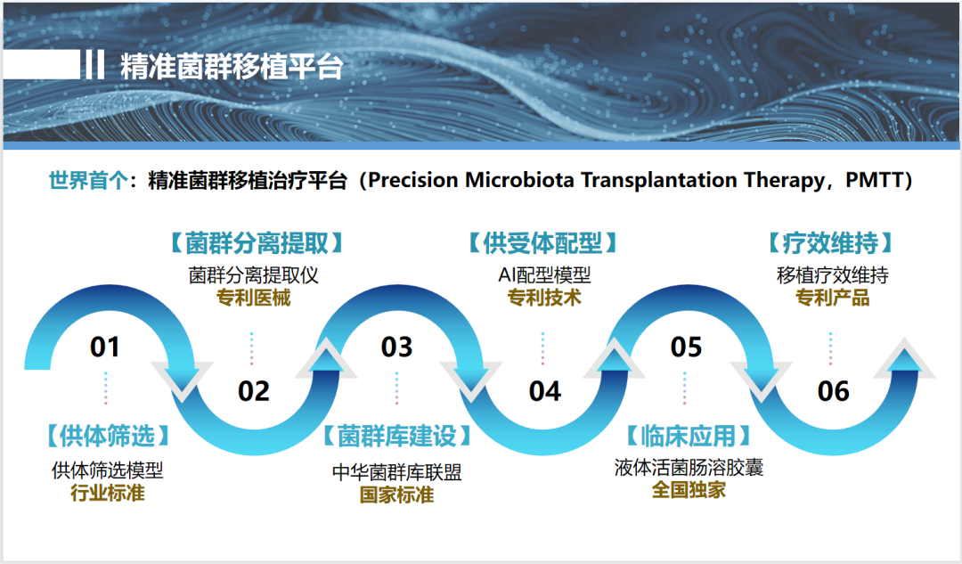 集团旗下拥有六大核心技术平台:精准菌群移植治疗平台、微生物制备医械技术平台、临床微生物检测技术平台、微生态医疗大数据云平台、肠道菌群工业化提取平台、微生物药物筛选开发平台;以“精准菌群移植”核心技术为依托提供五大解决方案,构建以菌库为核心的业务体系;强力布局微生态产业五大领域:包含承葛医学检验、承葛健康、承葛制药、承葛生物技术以及未来微生态医院,打造完整闭环微生态医疗体系,构造微生态全产业链集约式解决型企业。目前拥有9个面对不同适应症的菌群移植产品和服务,已经在16个省获得菌群移植收费编码,为超过300+家医疗机构提供专业服务,菌群移植与肠道菌群检测超过10万+人次。