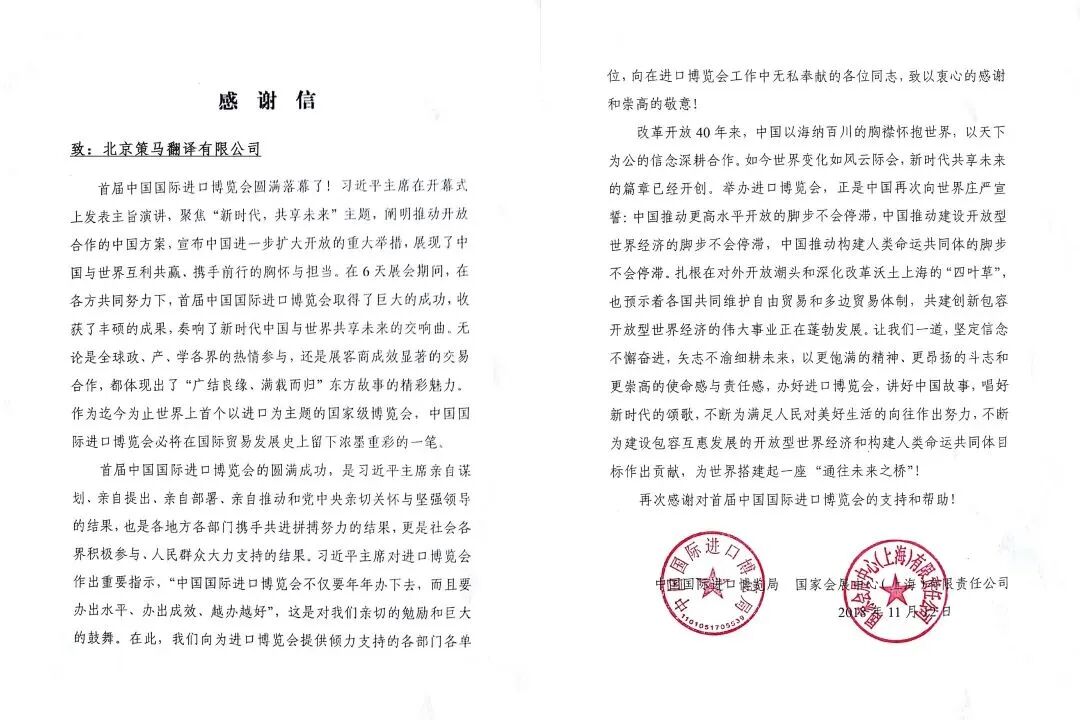 每一届进博会上,都少不了策马的身影,为其各项活动的顺利开展保驾护航。2018年,策马翻译凭借自身雄厚的专业实力和缜密的服务流程,中标成为中国国际进口博览会官方翻译服务供应商。作为联合国官方翻译服务供应商(ID:496547)、联合国全球契约组织成员(ID:109301)以及亚太经合组织(APEC)峰会、博鳌亚洲论坛等盛事的官方翻译服务供应商,策马集团拥有成熟的专业团队、丰富的翻译经验、严格的质控流程、敏捷的响应速度,在品牌声望、客户体验等方面优势显著。