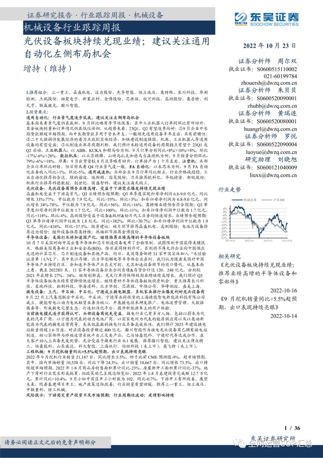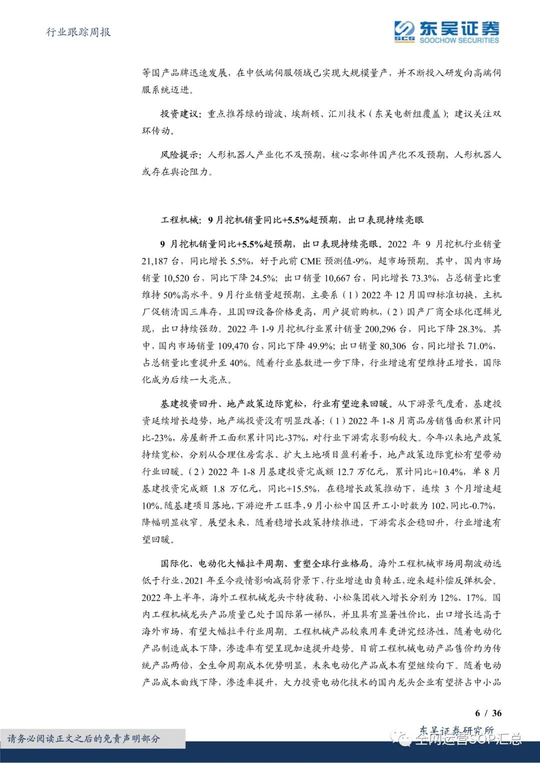 其中,国内市场销量 10,520 台,同比下降 24.5%;出口销量 10,667 台,同比增长 73.3%,出口持续超市场预期。2022 年 1-8 月商品房销售面积累计同比-23%,房屋新开工面积累计同比-37%,地产下滑对行业需求形成拖累,但政策端已呈现边际宽松。2022 年 1-8 月基建投资完成额 12.7 万亿元,累计同比+10.4%,9 月小松中国区开工小时数为 102,同比-0.7%,下游开工有所改善。展望未来,随着基建项目开工、地产政策边际改善,行业销量有望回暖。推荐三一重工、恒立液压、中联重科、徐工机械。