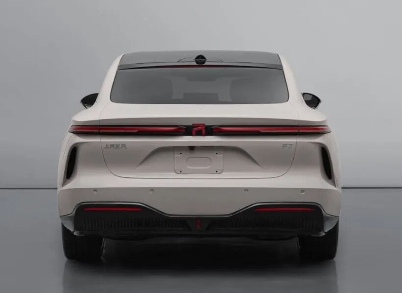 车尾部分,新车采用贯穿式尾灯设计,中央设置了一个红色的「R」字车标。