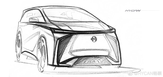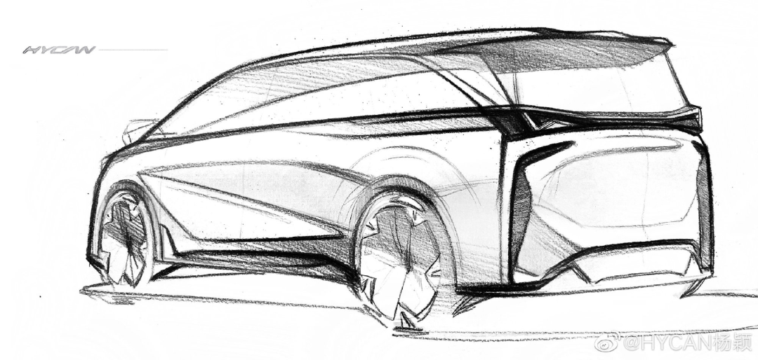 一张设计草图显示,合创 MPV 将采用封闭式车头造型,搭配贯穿式大灯设计,前脸比较夸张,车尾也采用了贯穿式尾灯设计,一改 MPV 方正的印象,整体修长颇具动感。