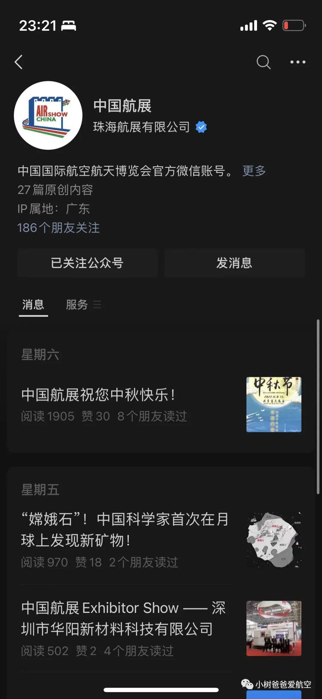 2、中国航展微信公众号,这是航展的官方号。我看了下,现在提供的服务中未直接包含航展售票,估计到了票开售的时候,就会出现一个门票销售的按钮,按了后会直接调出售票小程序。公众号是这个样子。