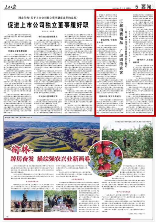 4月15日,《人民日报》第05版要闻刊发文章《汇聚消费精品 广迎四海宾客——第三届中国国际消费品博览会侧记》,关注第三届中国国际消费品博览会,版面图及全文如下: