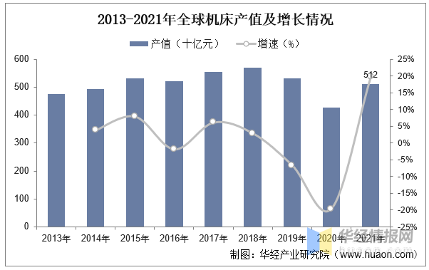 根据VDW(德国机床制造商协会)数据,2013-2021年,全球机床产值呈现出波动变化走势,得益于疫情后全球经济的复苏,2021年全球机床产值约为5120亿元,同比增长20%。