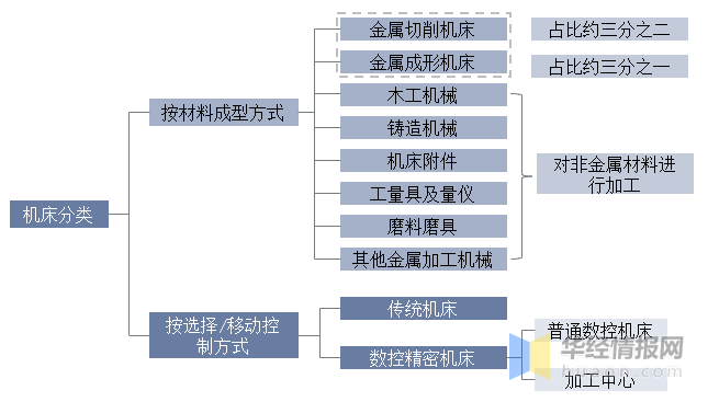 机床种类繁多,按材料成形方式分,机床主要可以分为金属切削机床、金属成形机床、铸造机械、木工机械、机床附件、工量具及量仪、磨料磨具和其他金属加工机械八个子行业。其中,金属切削机床是使用最广泛、数量最多的机床类别。一般而言,狭义上的机床便是指金属切削机床。金属切削机床是指用切削、磨削或特种加工方法加工各种金属工件,使之获得所要求的几何形状、尺寸精度和表面质量的机床;按机床控制系统分类,机床主要可以分为传统机床及数控精密机床两类。