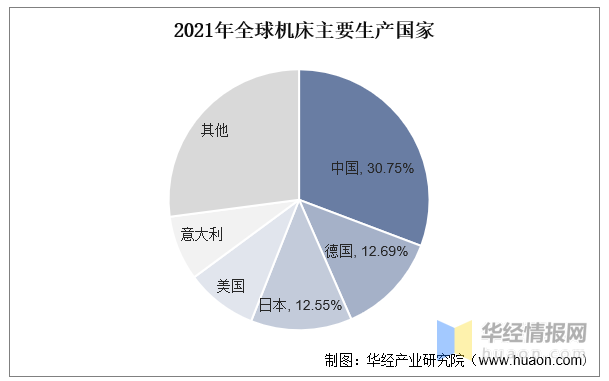 中国是全球机床生产和消费最大市场。2021年全球机床行业产值约为5120亿元,其中我国产值为1573.9亿元,占据30.75%的份额,位居首位;其次是德国、日本,市场份额分别为12.69%、12.55%。