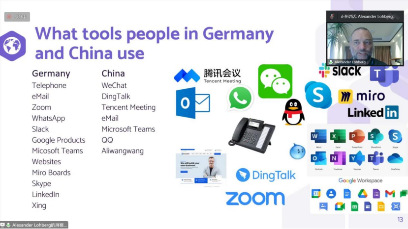 Parker Alex咨询公司创始人Alexander Lohberg通过讲述自己在疫情下回到中国,以及帮助中德创业者交流工作的经历和经验,分享了疫情下中国与国际企业在线上交流、建立良好互信商业关系遇到的挑战,包括线上交流工具使用熟练度、线上会议缺乏线下亲密度、文化交往差异等等。他认为中外企业在交往过程中应当敞开心扉,保持开放心态,坦诚平等交流。