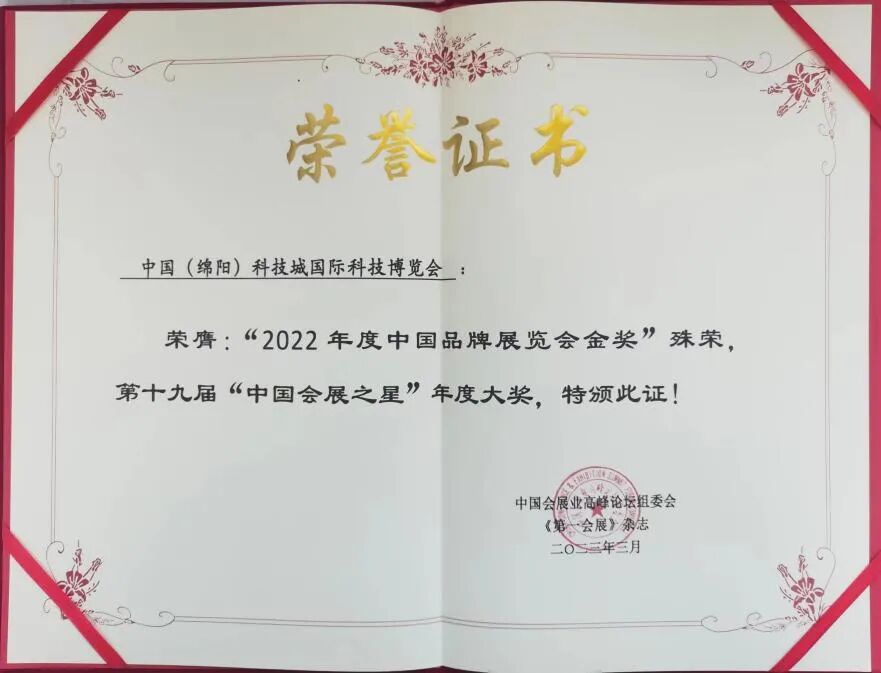 近日,经全国城市会展办、行业协会、知名专家、权威机构共同评选,中国(绵阳)科技城国际科技博览会荣膺第十九届“中国会展之星”年度大奖、“2022年度中国品牌展览会金奖”。