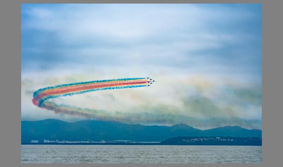说些奇怪的拍摄机位吧。珠海航展公认的最佳机位就是炮楼。炮楼之后的金凤台,虽然装修好了,却居然不对外开放,莫名其妙。在机场大道对面,也有一些民宿楼顶可以拍摄,这些位置虽然比较远,但不至于6点就要去抢位。只要镜头够长,而且这里拍摄降落更好。 最让我吃鲸的是还有海上机位。从深圳开来的游艇,看完就开走。完全无接触不用扫码做核酸。。。。拍摄效果如下图,拍个表演队拉烟麻麻地,但是单机表演就基本只能看个苍蝇样子。适合口味独特的拍机佬。