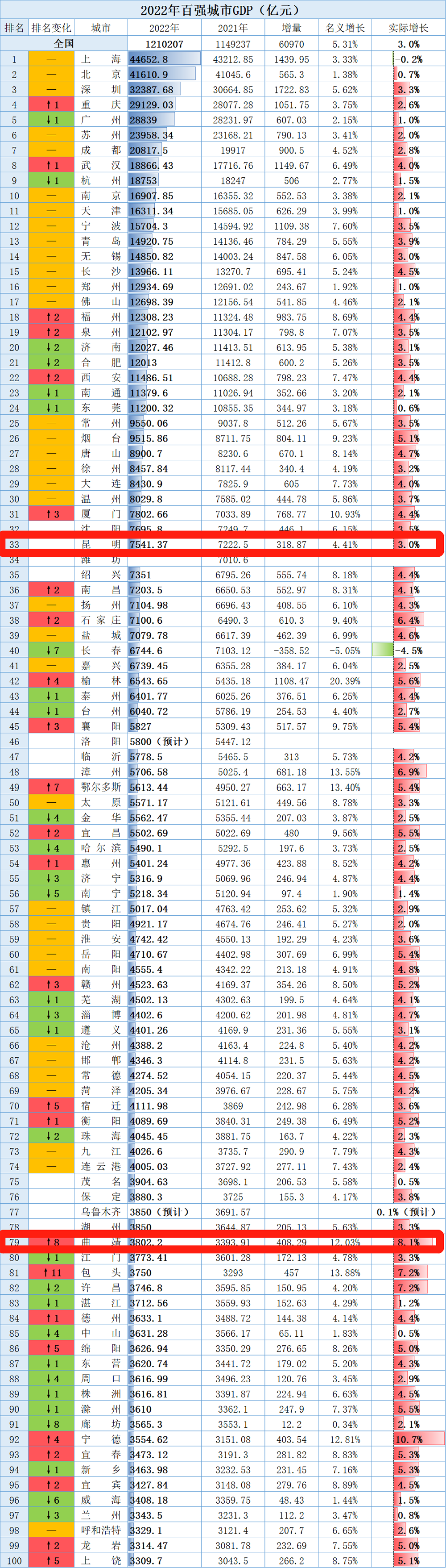 近日,2022年全国GDP百强城市出炉,上榜门槛提高,增幅达7.35%。云南两地上榜。