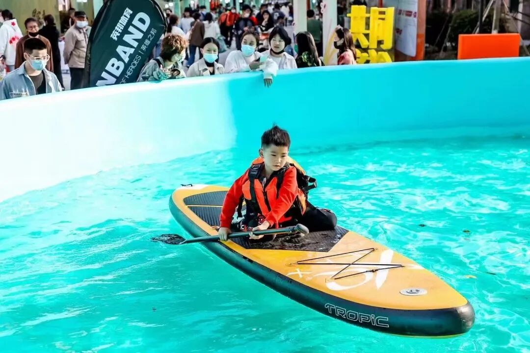 城市中心怎么玩浆板?2022西博会上的露天泳池会给你答案的,10m X 15m,蓝汪汪的一整池清水,阳光下波光粼粼,太惹人眼球了。