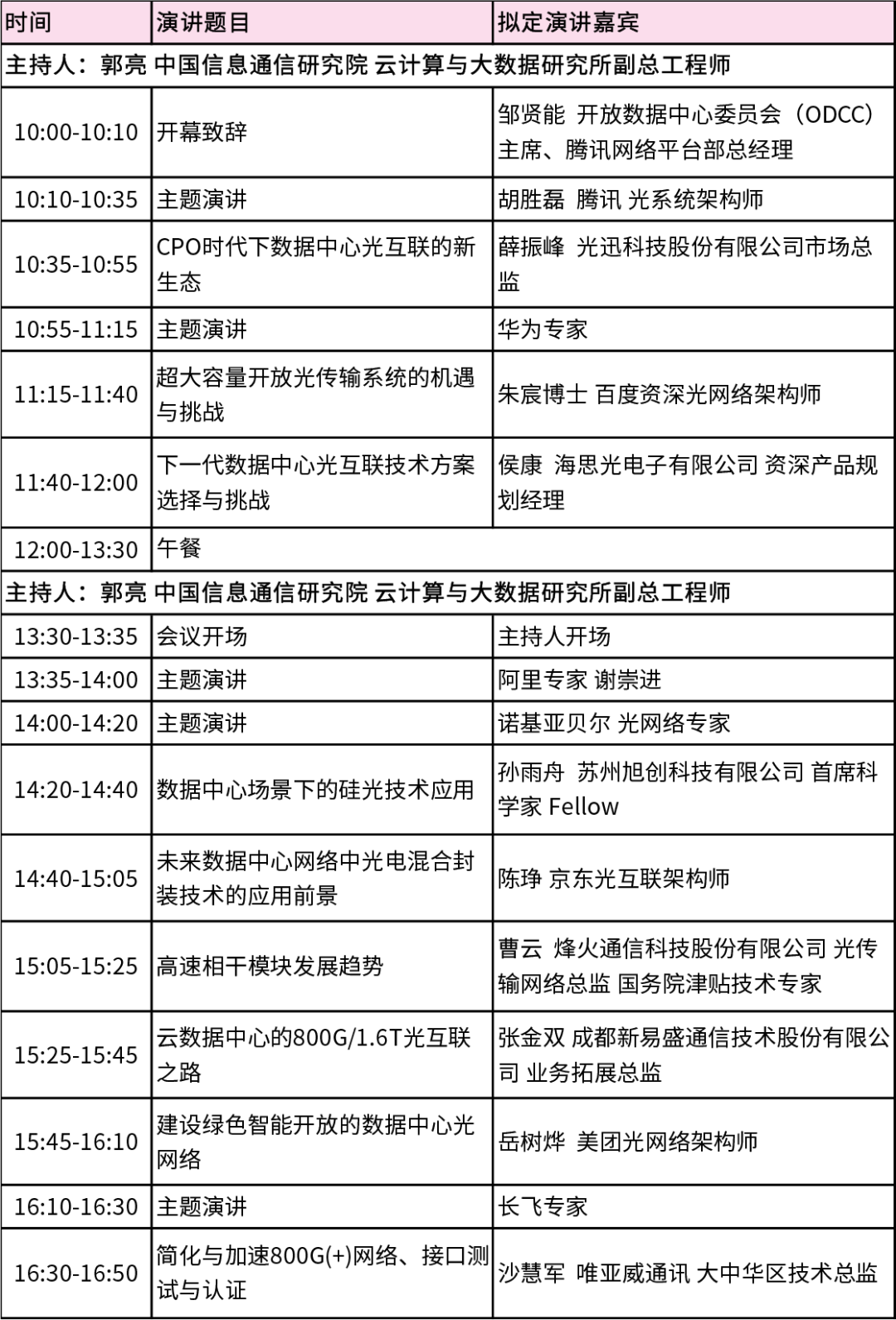 数据中心光互联演进趋势论坛 随着云数据中心的快速发展和流量的持续上涨,数据中心光互联网络架构发展出现了不同的演进趋势,从400G到800G,未来一路迈进6.4T、12.8T甚至到25.6T之后,这对数据中心高速传输技术从网络层面、服务器、交换机设备容量层面、芯片及模块层面提出了更高的需求。 CIOE邀请阿里、腾讯、京东、百度、快手、美团等互联网服务商、华为、诺基亚贝尔、烽火等数据中心设备商和核心模块器件厂商等共同探讨未来数据中心高速传输网络互联发展趋势。覆盖话题包括:CPO时代下数据中心光互联的新生态、超大容量开放光传输系统的机遇与挑战、数据中心场景下的硅光技术应用、未来数据中心网络中光电混合封装技术的应用前景、云数据中心的800G/1.6T光互联之路、建设绿色智能开放的数据中心光网络等。