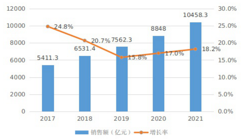 2021年,在国内宏观经济运行良好的驱动下,国内集成电路产业继续保持快速、平稳增长态势,产量达到3594亿块,同比增长33.3%。据中国半导体行业协会统计,2021年中国集成电路产业销售额为10458.3亿元,同比增长18.2%。其中,设计业销售额为4519亿元,同比增长19.6%;制造业销售额为3176.3亿元,同比增长24.1%;封装测试业销售额2763亿元,同比增长10.1%。